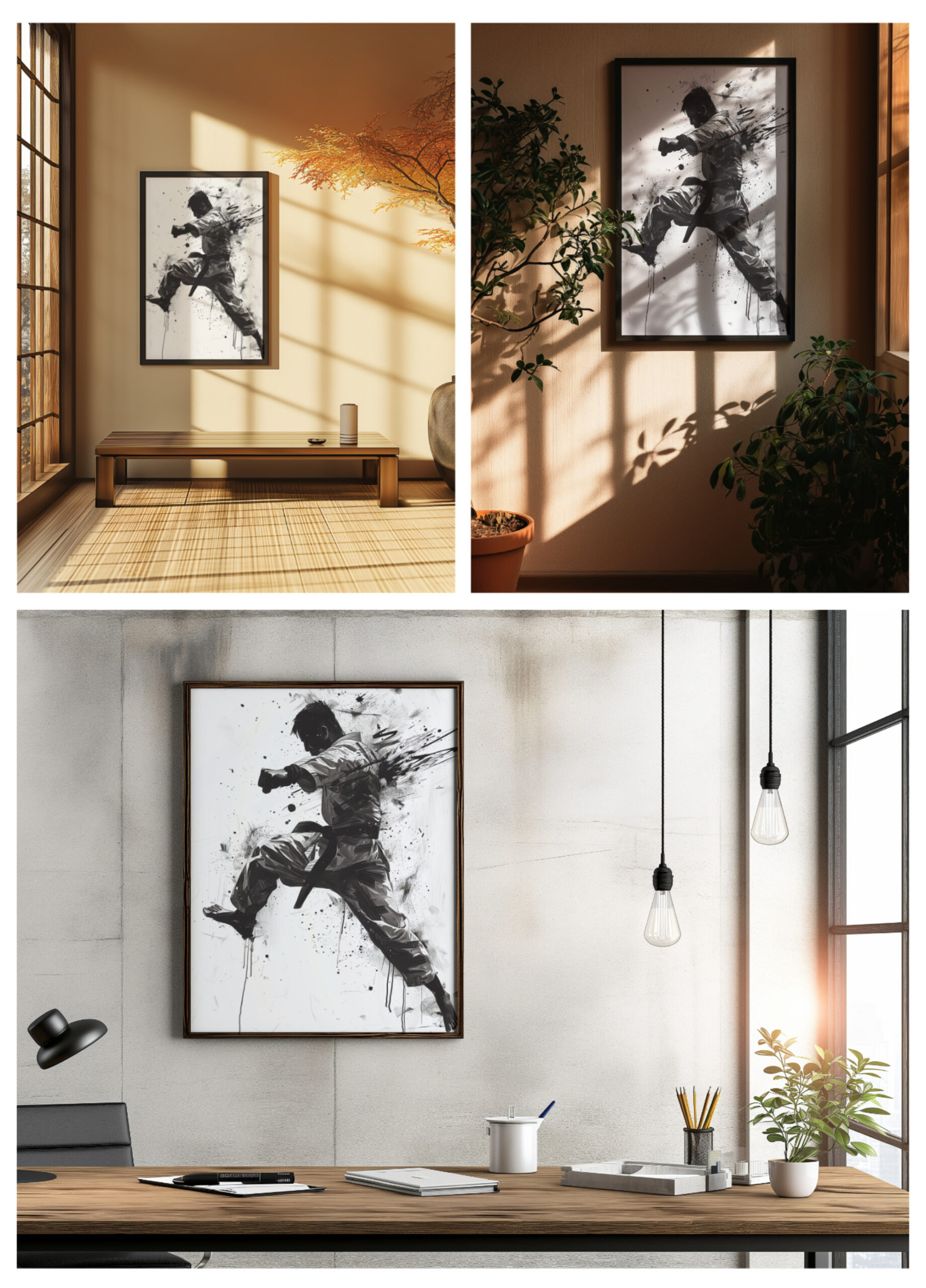 Our minimalistic ink brush paintings are inspired by the elegance of Karate and the simplicity of Japanese design. They make perfect decorations for your home, office, gym, or Dojo.
